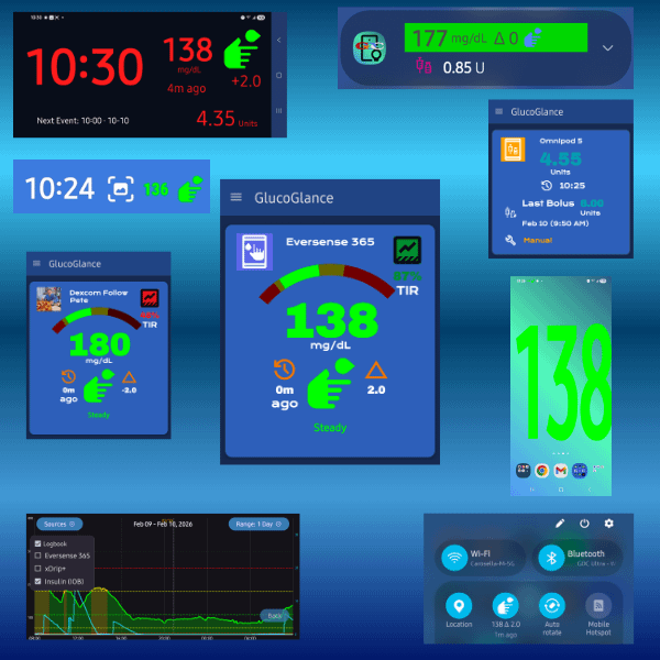 Surface glucose and insulin across your entire phone experience—Home UI cards, status bar indicators, rich notifications, Quick Settings tiles, Live Wallpaper, and a high-visibility Desktop Clock for bedside monitoring.